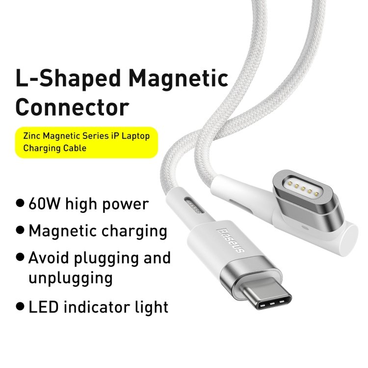 Baseus 60W 2M Zinc Magnetic Series iP Laptop Charging Cable Type-C to L-shaped Port White – CATXC-W02