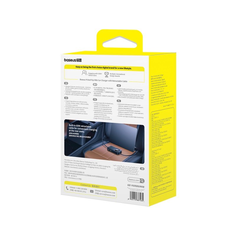 The Baseus PrimeTrip VW1 Car Charger with Retractable Cable 60W – Cosmic Black (Model: C00069000121-00) is a high-performance, multi-device charging solution designed for convenience and efficiency during travel.