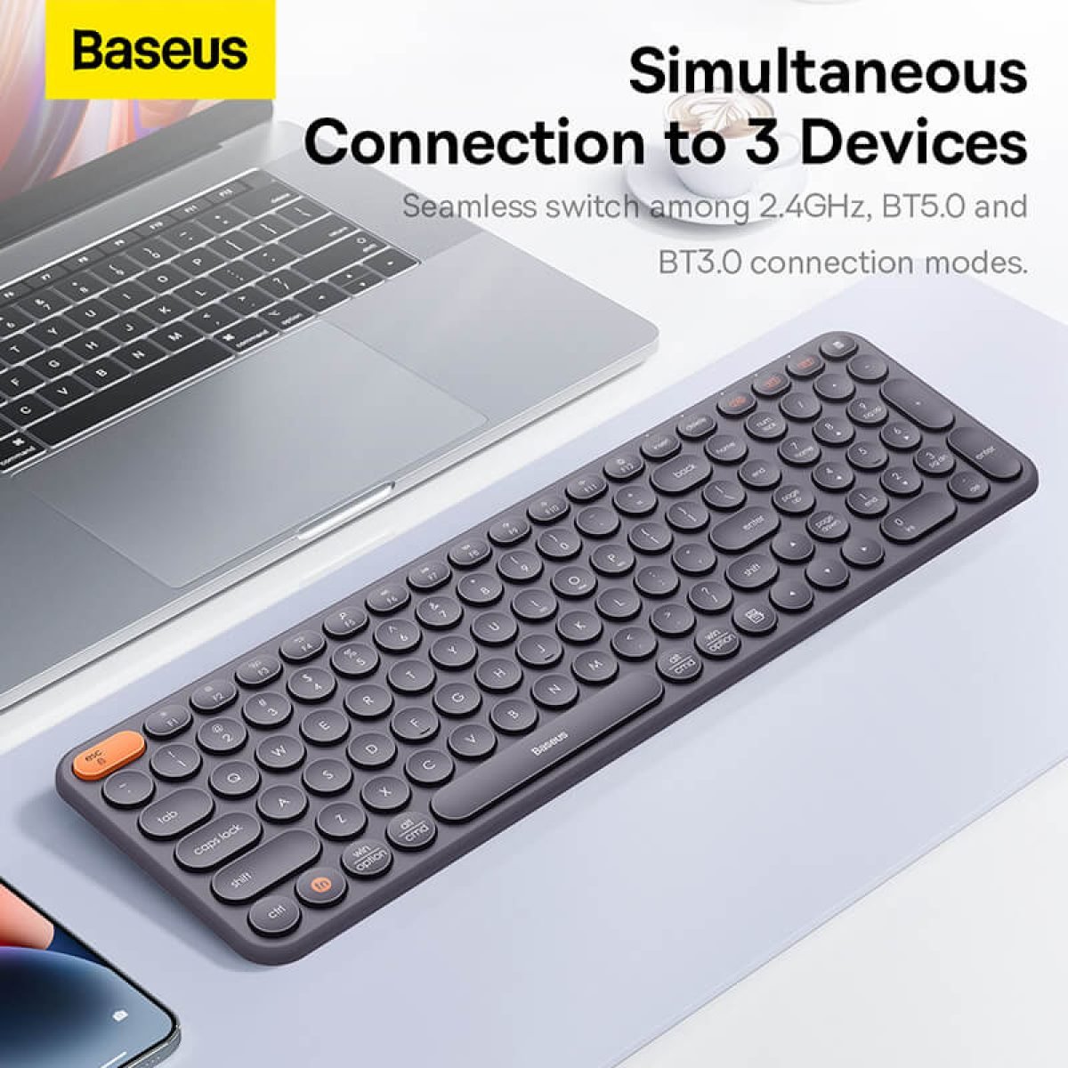 Introducing the Baseus K01B Creator Wireless Tri-Mode Keyboard, a cutting-edge device designed to elevate your creativity and boost productivity. This versatile keyboard offers seamless connectivity through three modes: Bluetooth 5.0, 2.4GHz wireless, and Bluetooth 3.0. Effortlessly switch between your desktop, tablet, and smartphone with just a single keystroke, enhancing your workflow like never before.