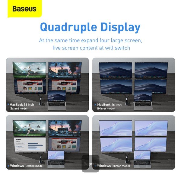 The Baseus UnionJoy 14-Port Three-Screen Multifunctional Type-C HUB Adapter is designed to enhance your productivity by expanding your device’s connectivity options. With support for up to three external displays and a variety of ports, this HUB adapter is ideal for professionals, creatives, and multitaskers.