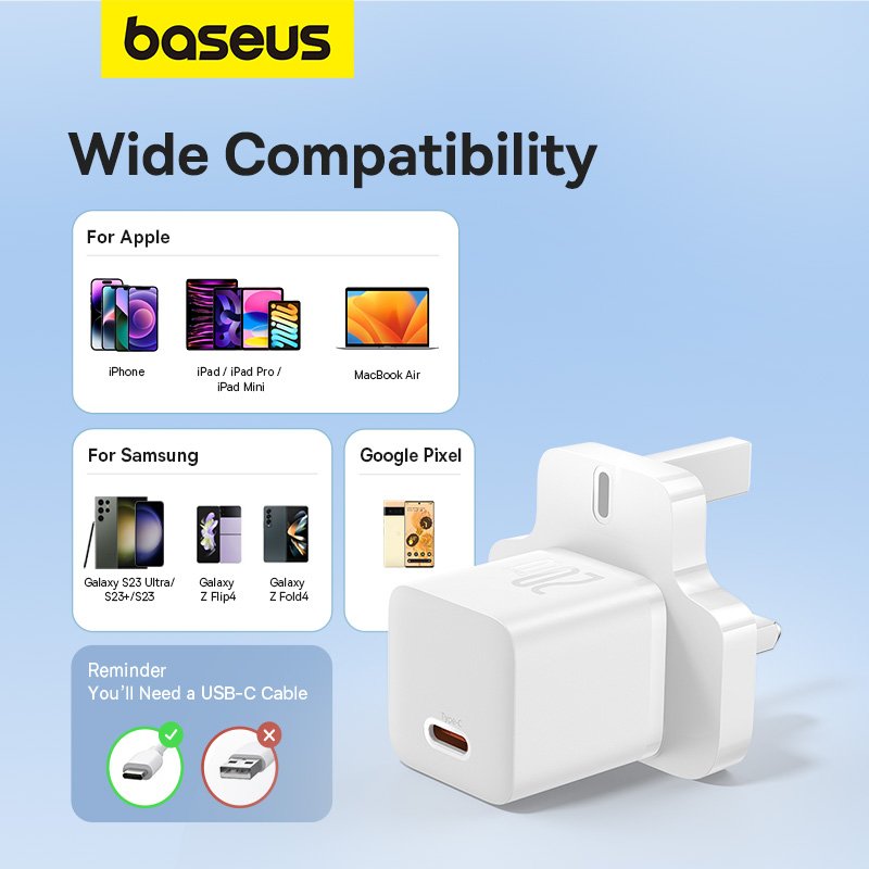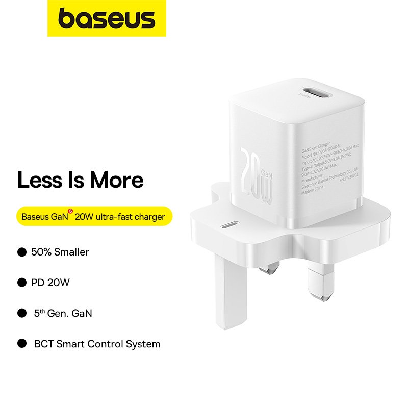 Charging AdaptersBaseus 20W GaN5 Mini Fast Charger Type-C UK Pin – Moon White
