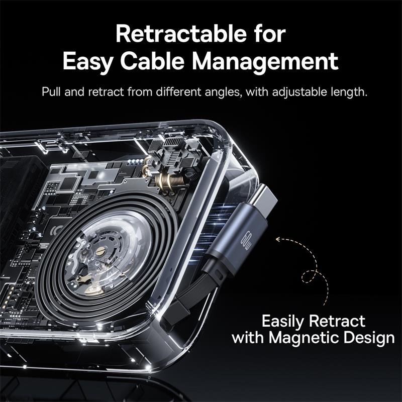 Retractable 60W Cable: Features a fast-charging retractable cable, extending up to 1.5 meters, providing flexibility and reducing clutter.