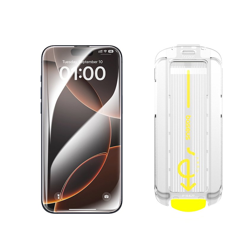 Baseus Crystal Full-Coverage HD Etched Tempered Glass Screen Protector with Built-in Dust Filter for iP16 Pro Clear Pack of 1 (Includes Dustproof Installation Tool 2 and Cleaning Kit*1) – P6001206N201-00
