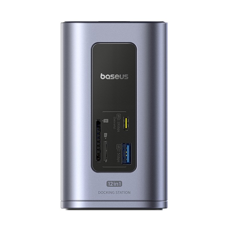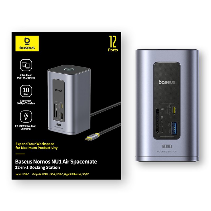 The Baseus NU1 Air Spacemate is a sleek, compact 12‑port docking station built in a slim vertical aluminum chassis (approx. 65.5 mm × 115.5 mm). It offers expansive connectivity for laptops and ultrabooks, blending dual‑4K display support, fast charging, ultra‑fast data, and essential everyday ports.