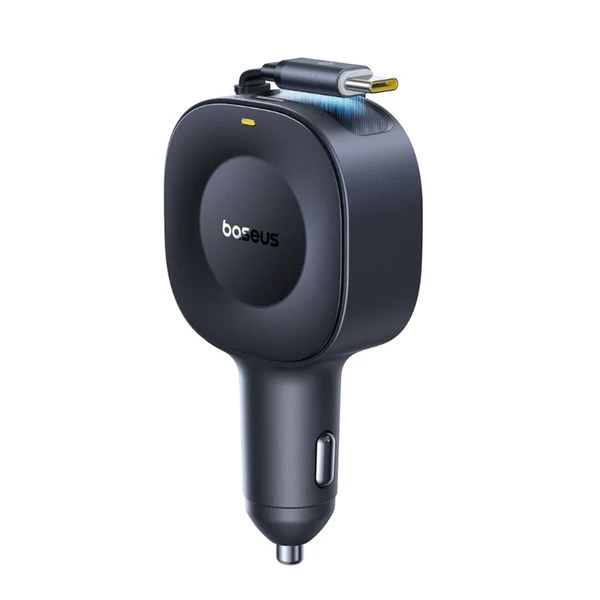 A sleek, compact car charger featuring dual retractable USB‑C cables and a dedicated USB‑C port. Designed for tidy, cable-free charging in vehicles, it delivers fast 30 W output for each connection while adapting to your car’s layout