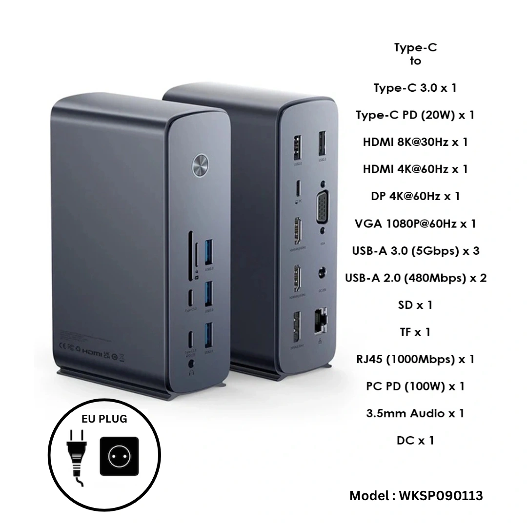 Baseus UnionJoy Pro 17-Port Four-Screen Multifunctional HUB Docking Station (EU Pin Power Adaptor) (Type-C to 1 x Type-C 3.0 + 1 x Type-C PD (20W) + 1 x HDMI 8K@30Hz + 1 x HDMI 4K@60Hz + 1 x DP 4K@60Hz + 1 x VGA 1080P@60Hz + 3 x USB-A 3.0 (5Gbps) + 2 x USB-A 2.0 (480Mbps) + 1 x SD + 1 x TF + 1 x RJ45 (1000Mbps) + 1 x PC PD (100W) + 1 x 3.5mm Audio + 1 x DC) – Gray – WKSP090113